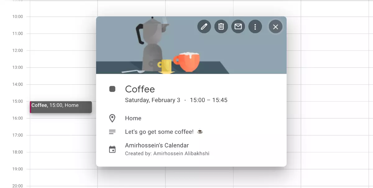 A moka pot next to a cup image appeared as the event image after setting "Coffee" for the event title.