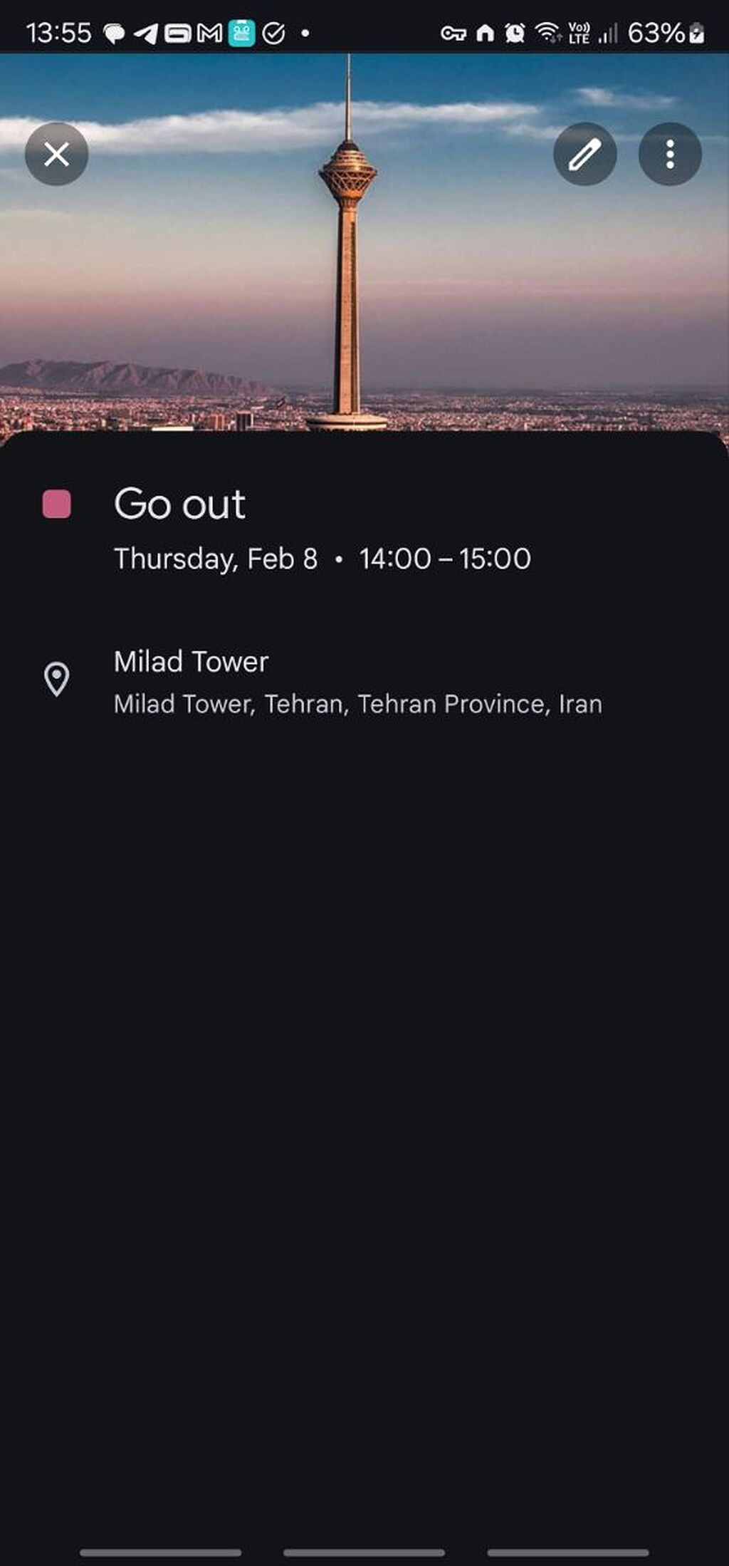 In the image below, you can see an event that takes place at Milad Tower in Tehran. Google Calendar has selected this image for it using the event's location.